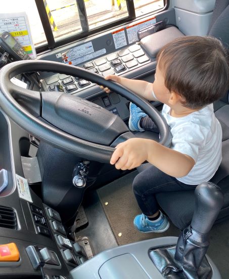 柊ちゃんはバスの外見は好きだけど中に乗っても楽しめるかな?と思っていましたが、運転席はとても気に入った様子。